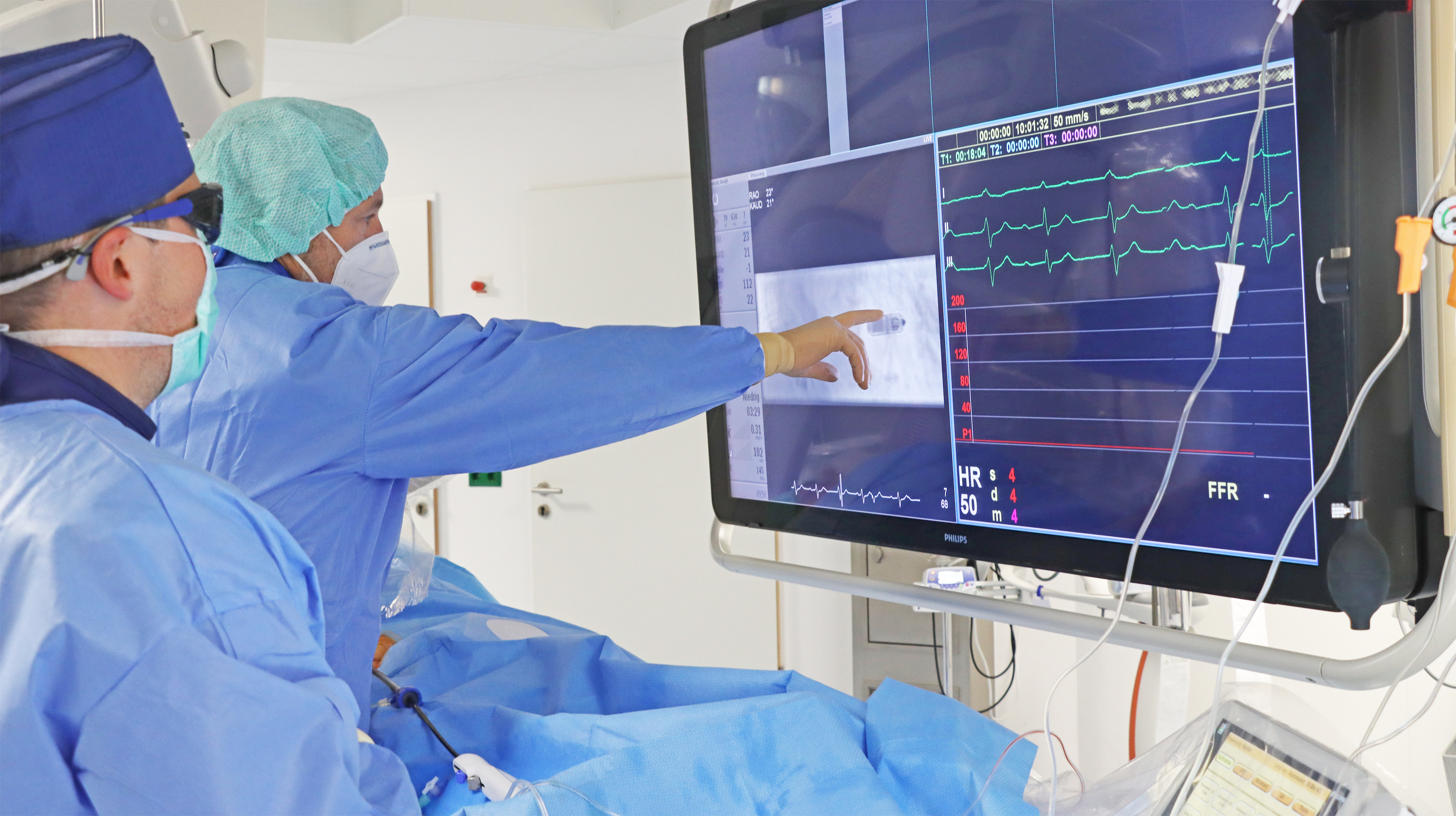 Kathetergestützte Verfahren haben am Standort eine lange Tradition. Schon die vorangegangenen Chefärzte der Inneren Medizin behandelten verengte Gefäße auf diesem Weg. Bei einem solchen Eingriff führen Ärzt:innen einen dünnen, biegsamen Kunststoffschlauch über ein Blutgefäß bis zum Herzen oder zu anderen Gefäßabschnitten. So lassen sich Engstellen erkennen, Durchblutungsstörungen messen und im selben Eingriff oft auch behandeln.